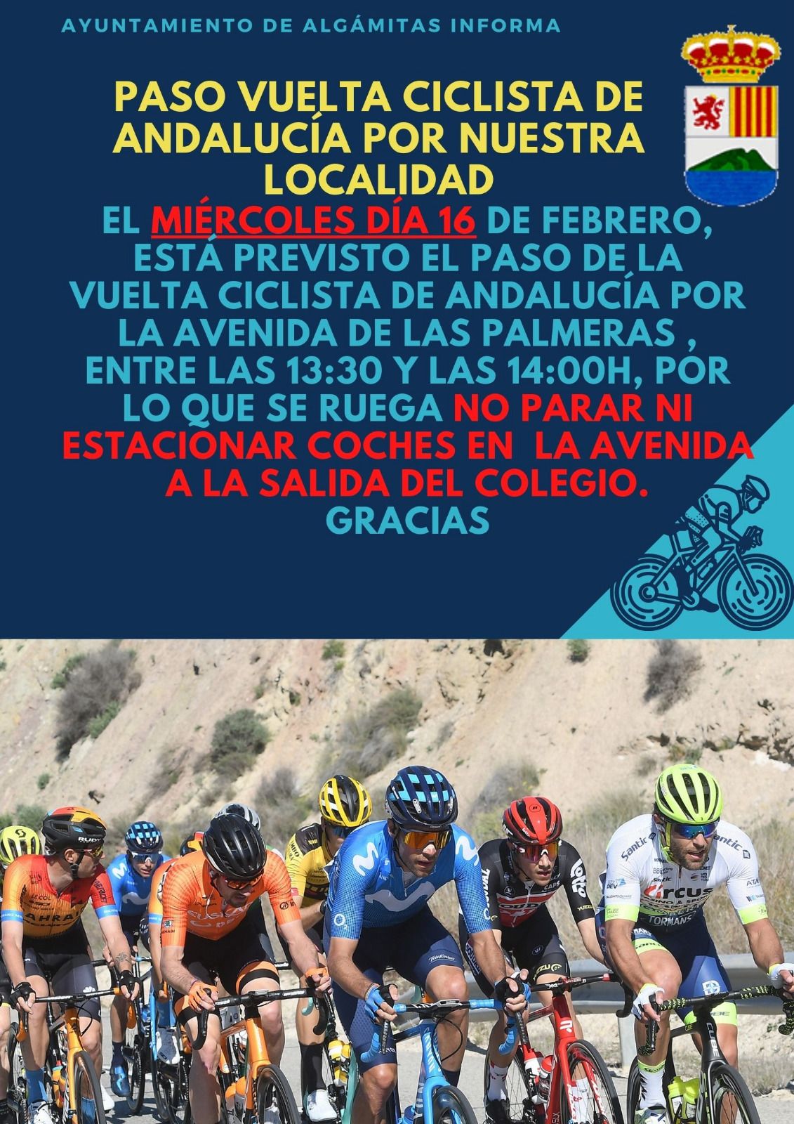 El miércoles día 16 de febrero, está previsto el paso de la vuleta ciclista de Andalucía por la Avenida Las Palmeras. Se prevé que recorra nuestro municipio en tre las 13:30 y las 14:00. Por este motivo, se ruega que no estacionen, ni paren vehículos que puedan dificultar el paso de la carrera.