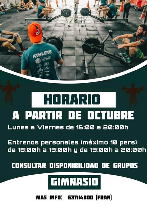 A partir de octubre los horarios de entrenos personales con un número máximo de 10 personas serán de 18:00 horas a 19:00 horas y de 19:00 horas a 20:00 horas. Será necesario consultar la disponibilidad de los grupos en el gimnasio.